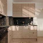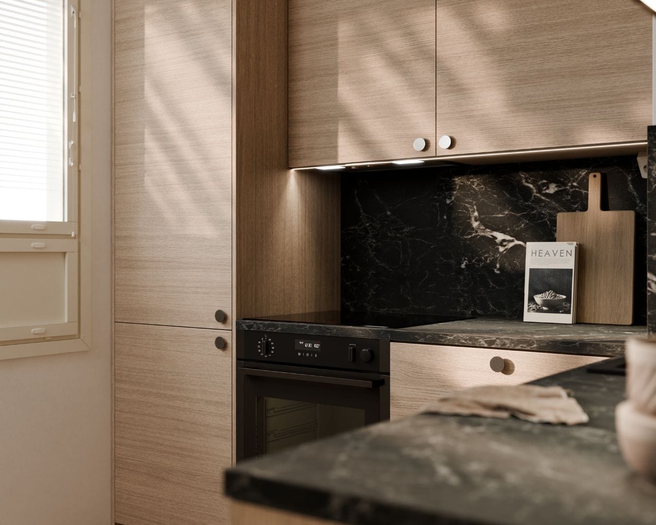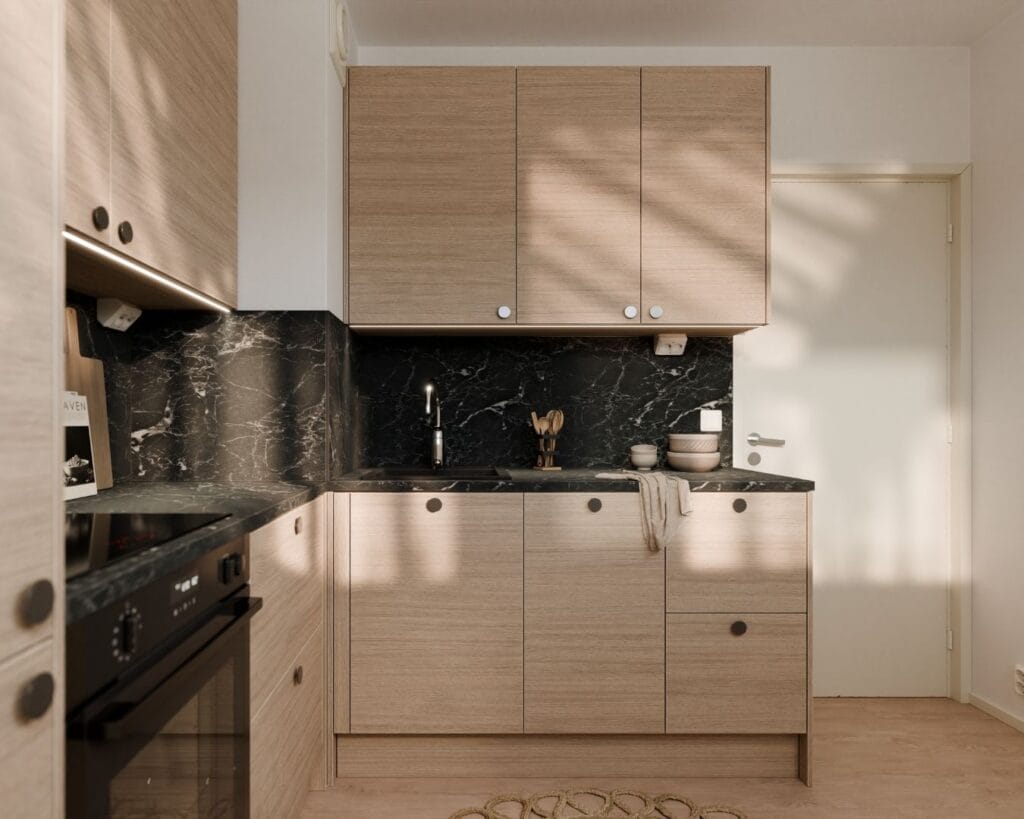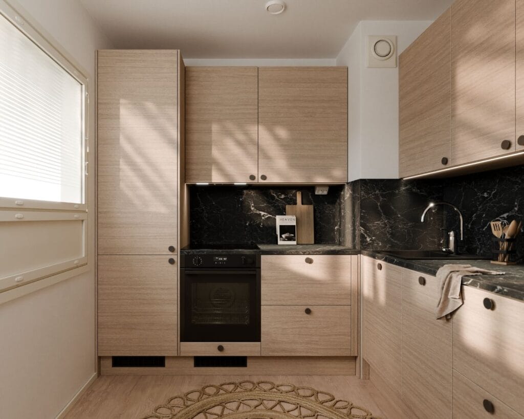 Vaalea puunsyykuvio on yksi suomalaisten suosikeista. Lämpimillä illan sävyillä tuodaan särmää keittiöön.