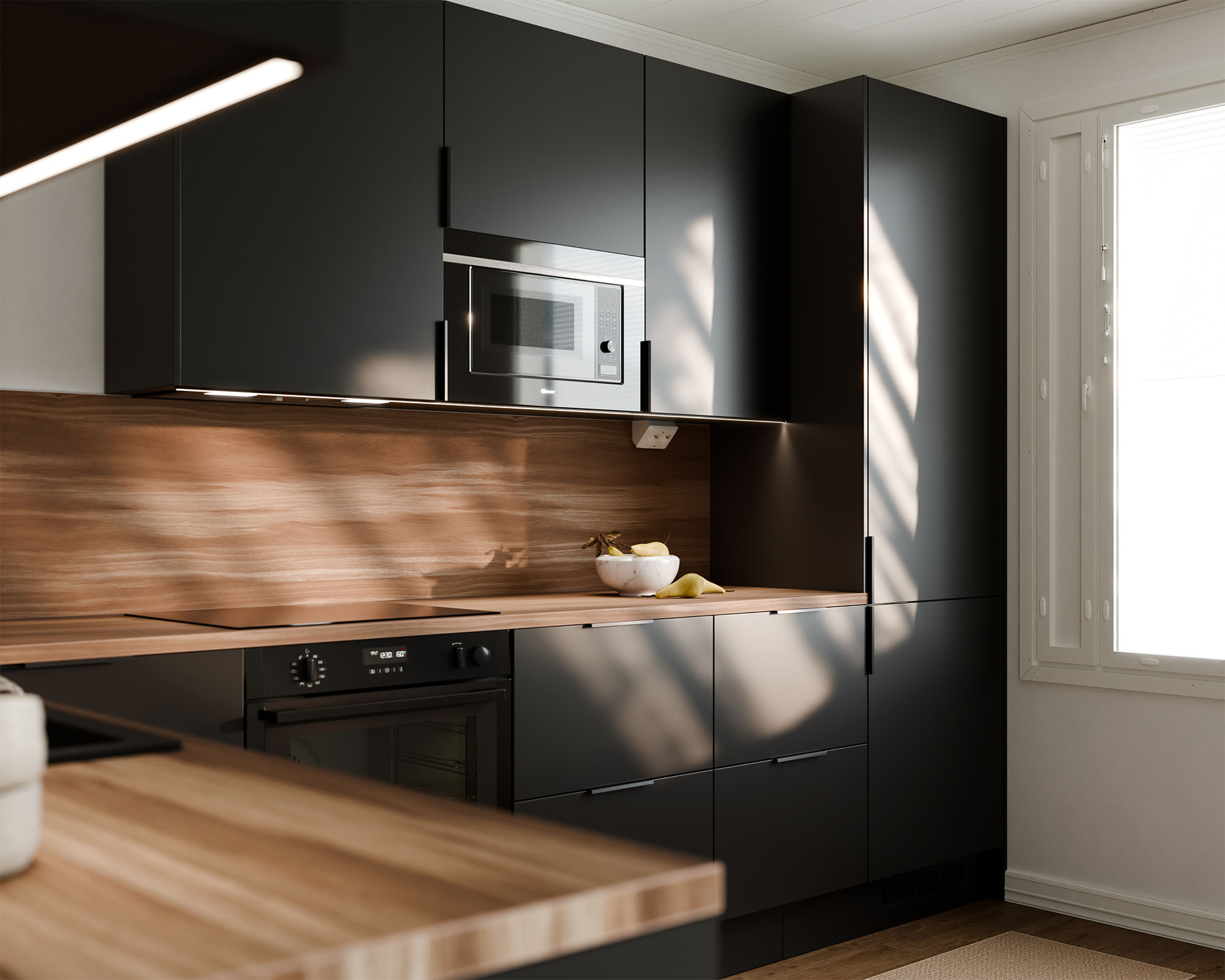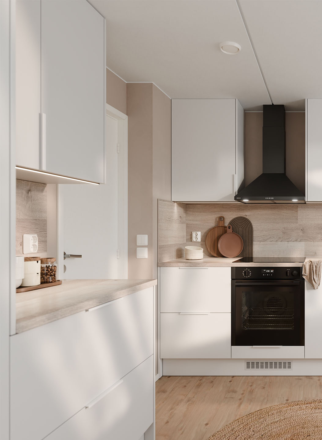 Kajo-mallistossa yhdistyvät funktionaalisuus ja estetiikka. Ovissa ei ole vetimiä – niissä on integroidut sormivedot, jotka viimeistelevät keittiön kevyen ja modernin ilmeen. Säilytystilat on suunniteltu huolella: jokaisella astialla, pannulla ja maustepurkilla on paikkansa, eikä ylimääräistä ole. Lopputuloksena on keittiö, jossa arki sujuu ja mieli lepää.